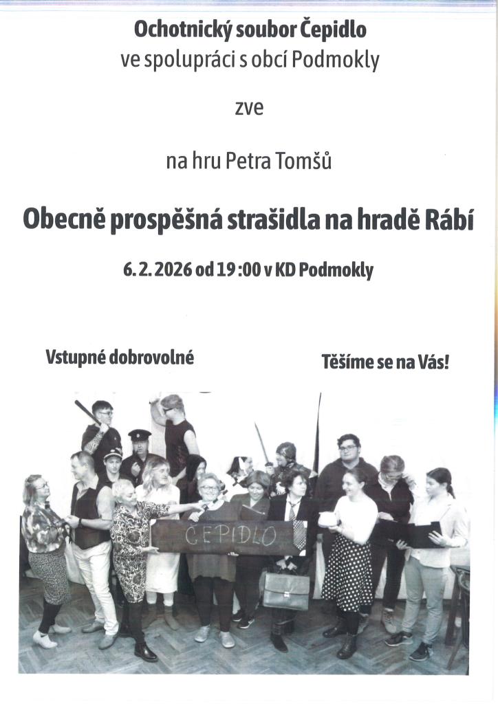 Ochotnický soubor Čepidlo ve spolupráci s obcí Podmokly zve na divadelní představení "Obecně prospěšná strašidla na hradě Rábí", které se uskuteční dne 6.2.2026 od 19:00 hod v KD Podmokly.