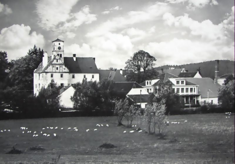 V pozadí lze vytušit všem dobře známý hrad Rabí, příjezdová cesta dostala asfaltový koberec až o mnoho let později.