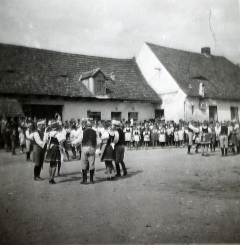 Poslední fotografií s tématem dožínek je snímek pořízený v Panském dvoře dnešní generaci lépe známý jako žichovický špýchar. Jak vypadá špýchar dnes ví zřejmě každý, ale jak je patrné ze snímku při dožínkách zde bylo opravdu veselo.